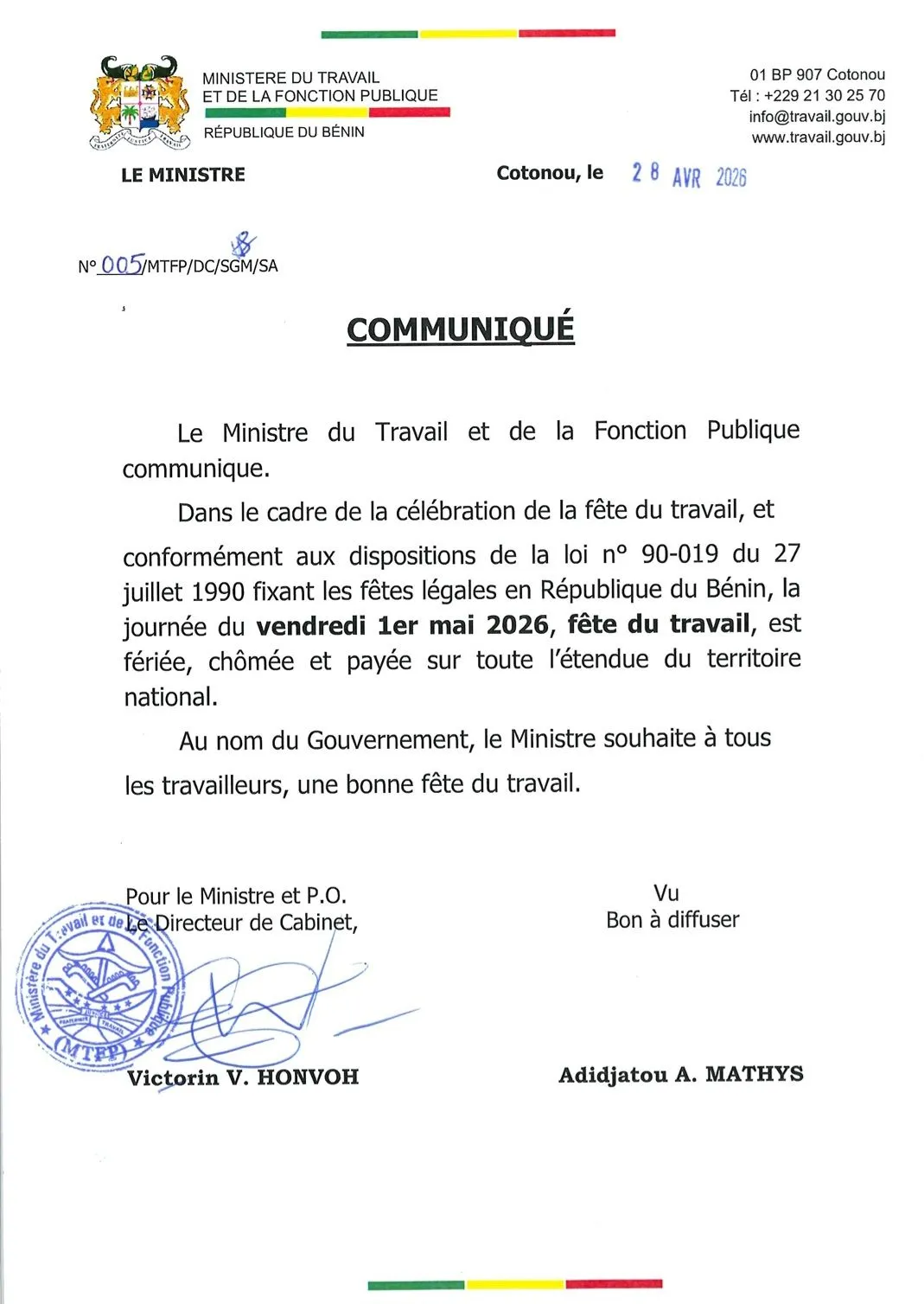 Cette mesure s’inscrit dans le cadre de la célébration de la fête du travail et conformément aux dispositions de la loi n° 90-019 du 27 juillet 1990 fixant les fêtes légales en République du Bénin. Le communiqué précise que cette journée sera observée comme fériée, chômée et payée sur toute l’étendue du territoire national.