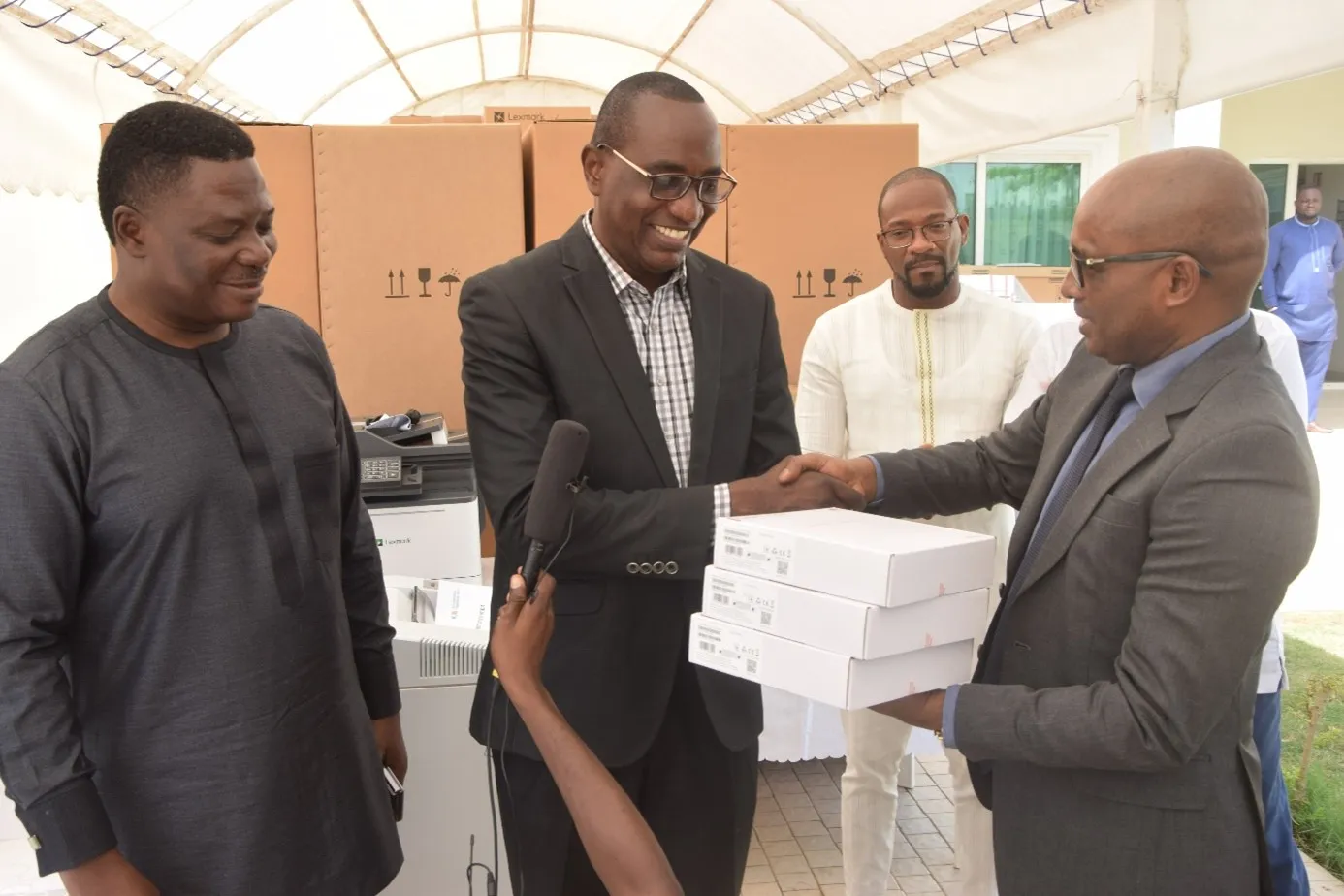 Pascal Nyamulinda (à droite) recevant symboliquement quelques équipements des mains de Noah Agbaffa-Padonou, représentant la ministre des Affaires sociales et de la Microfinance