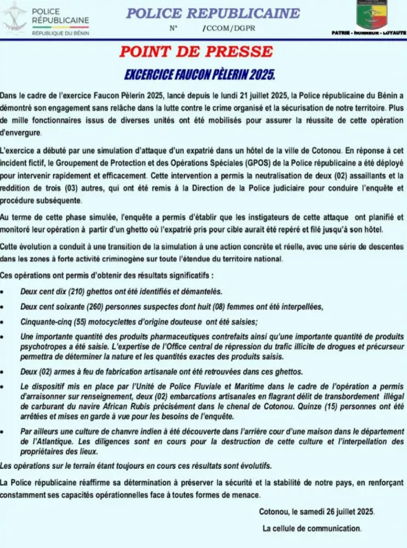 S'inscrivant dans une logique de changement de paradigme, l'exercice « Faucon pèlerin » permet à la Police républicaine de profiter de cette opération fictive pour prendre à défaut les hors-la-loi pour de vrai. Ainsi, la simulation d'attaque d'un expatrié dans un hôtel de la ville de Cotonou, s'est transformée en une opération concrète et réelle sur l'ensemble du territoire national.