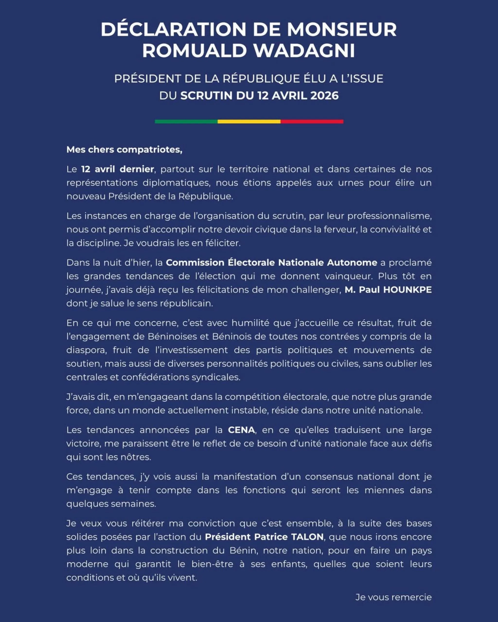 Le Bénin entre dans une nouvelle séquence de son histoire politique. Au lendemain du scrutin présidentiel du 12 avril 2026 et après la proclamation des grandes tendances par la Commission électorale nationale autonome (Cena), le donnant vainqueur, Romuald Wadagni a livré une première adresse à la Nation.