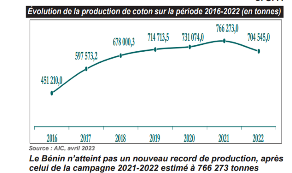 La production cotonnière s’afficherait à 704 545 tonnes au titre de la campagne 2022-2023 contre une prévision de 800 000 tonnes, selon les chiffres communiqués par l’Association interprofessionnelle de coton (Aic) citée dans le Document de programmation budgétaire et économique pluriannuelle 2024-2026 (Dpbep, avril 2023).