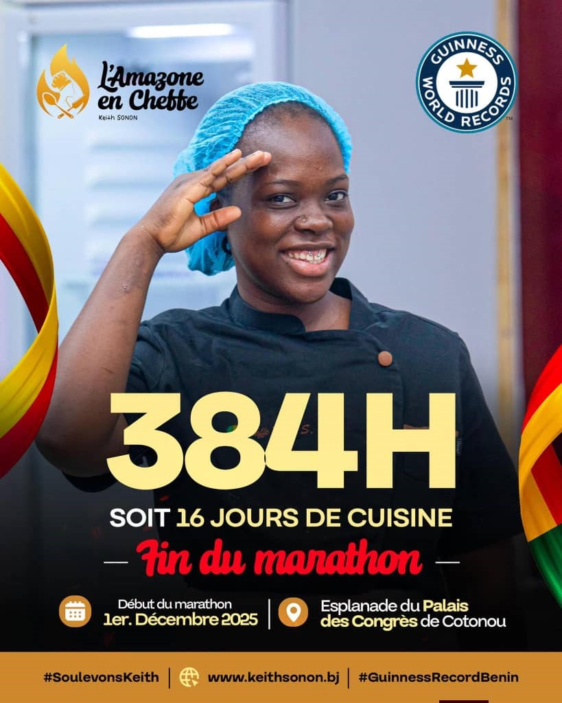 Groupes constitués, familles, jeunes, curieux et surtout fans inconditionnels ont défilé jour après jour pour assister au marathon et déguster les plats proposés. Une communion populaire autour de la cuisine, devenue le langage universel du partage et de la fierté nationale. À travers ses mille plats quotidiens, Keith Sonon a offert bien plus que des mets, une célébration de l’identité culinaire béninoise, un hommage au travail, à l’endurance et à la créativité. Au-delà du record, c’est toute une nation qui sort grandie de cet exploit. Keith Sonon incarne désormais la résilience, l’audace et le génie culinaire béninois, portant haut les couleurs du pays sur la scène mondiale. Au palais des Congrès de Cotonou, entre les flammes des fourneaux et les applaudissements du public, une page d’histoire s’est écrite. On n’y sentait pas que les épices, mais aussi la sueur du travail bien fait et la fierté d’un peuple. Les jours se sont succédé, les nuits aussi, sans rupture. Et pourtant, Keith Sonon est restée fidèle à elle-même. On la voyait présente, disponible, souriante. Même lorsque la fatigue s’installait, elle trouvait encore l’énergie d’encourager, de saluer, de servir, de danser...