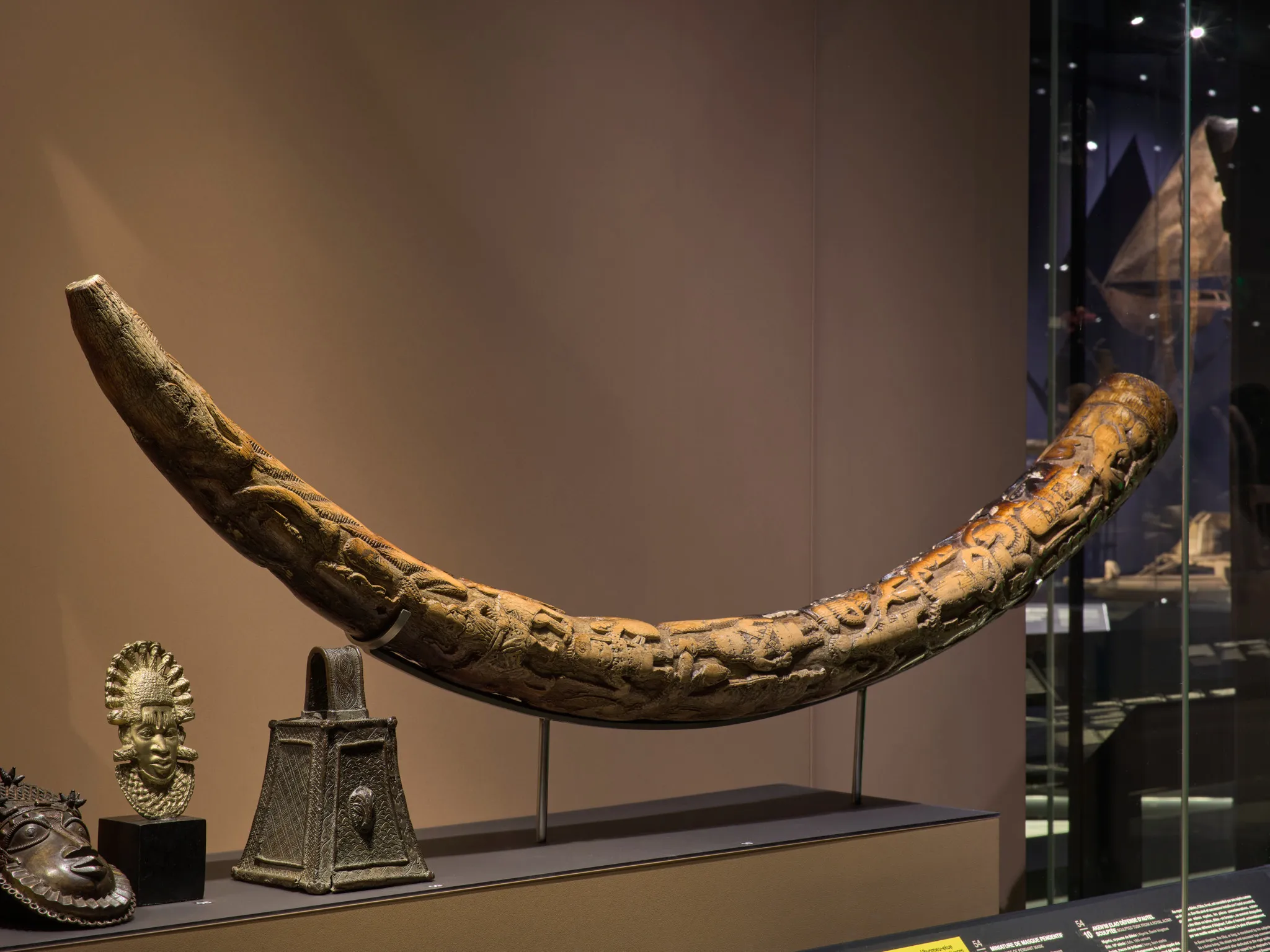 Parmi les œuvres restituées figure une majestueuse défense d’éléphant en ivoire, sculptée et marquée par les traces de l’incendie qui ravagea la Benin City en 1897. Passée entre plusieurs mains, elle est finalement acquise par le Meg en 1948 auprès du marchand William Ohly, grâce à un groupe de mécènes. Un masque de ceinture en bronze, porté par des initiés du palais royal, suit un parcours similaire. Mis aux enchères à Londres après l’expédition britannique, il est acheté en 1932 par Eugène Pittard, alors directeur du musée, auprès du marchand Hans Himmelheber. Enfin, une cloche du XVIIIe siècle ornée d’une tête de léopard, utilisée dans des rituels, est acquise en 1958 lors d’une vente à Bellevue, provenant d’une ancienne propriété du baron Maurice de Rothschild.