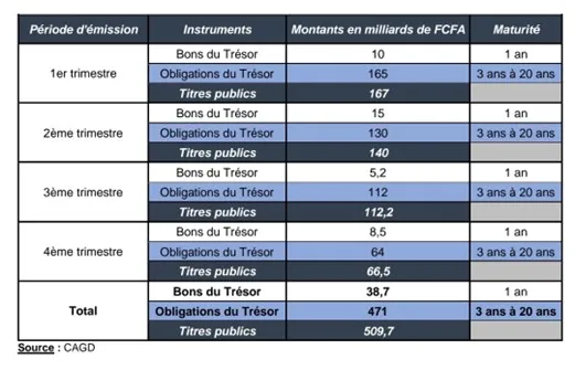 Les émissions seront réparties de manière séquentielle sur l’année, avec une concentration plus marquée au premier semestre qui devrait absorber 167 milliards F Cfa, essentiellement en obligations du Trésor. Cette programmation vise à anticiper les besoins de trésorerie de l’Etat tout en tenant compte des capacités d’absorption du marché régional des titres publics.