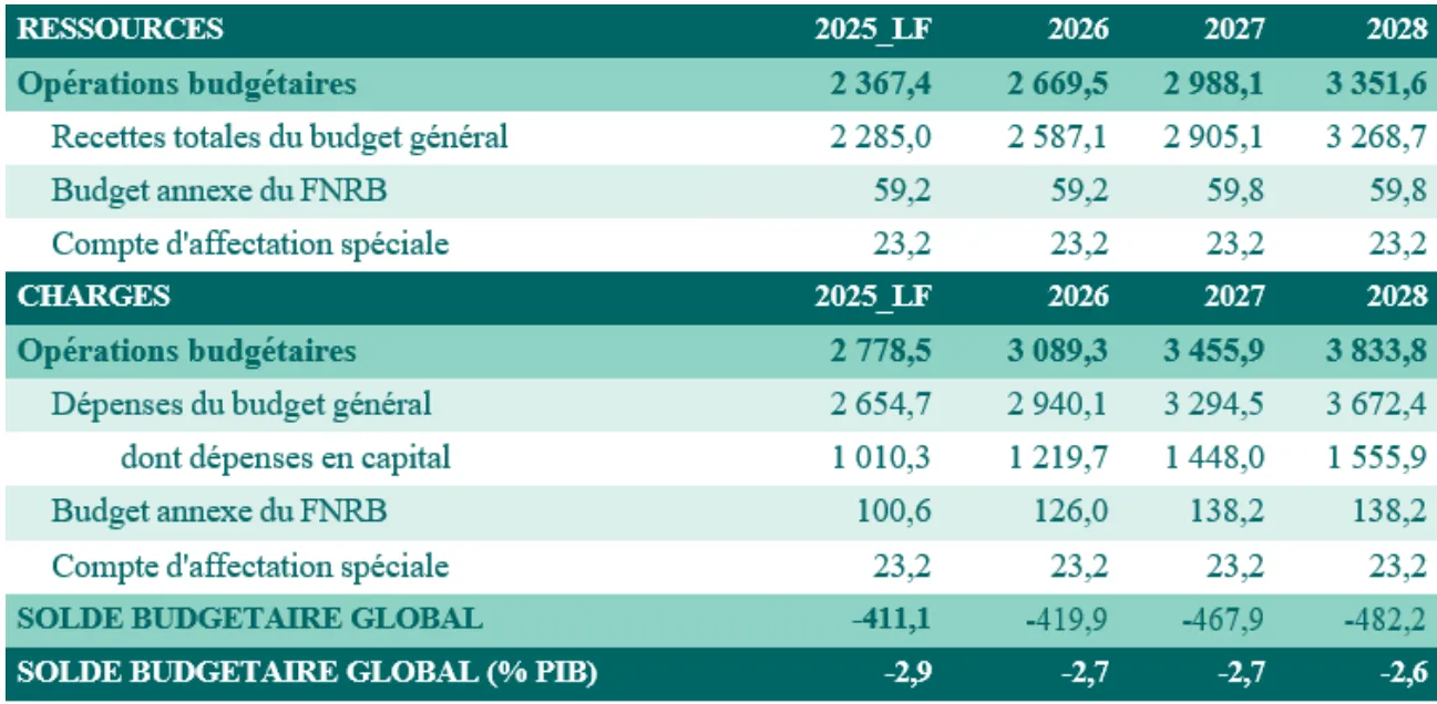 2026–2028 (Dpbep, Mef, mai 2025), le déficit budgétaire global passerait de
