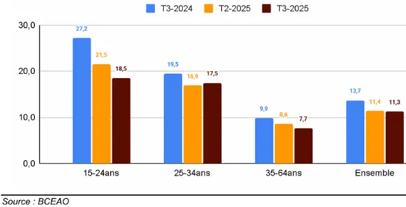 L’analyse selon le genre révèle des contrastes persistants, y compris au Bénin. À l’échelle de l’Union, le taux de chômage des femmes s’est établi à 15,6 % au troisième trimestre 2025, en hausse de 0,8 point de pourcentage par rapport au trimestre précédent. Cette évolution souligne les difficultés structurelles d’accès des femmes à des emplois stables et décents, souvent liées à leur forte présence dans des secteurs précaires et à faible productivité. À l’inverse, le taux de chômage des hommes a reculé de 0,4 point pour s’établir à 6,9 %, traduisant une meilleure résilience masculine sur le marché du travail. L’analyse par tranche d’âge apporte également des enseignements importants. Les jeunes de 15 à 24 ans enregistrent une baisse significative du chômage, de l’ordre de 3,0 points de pourcentage. Cette amélioration, perceptible au Bénin comme dans plusieurs pays de l’Union, est en partie liée à l’essor des activités informelles, à l’auto-emploi et aux programmes d’insertion socioprofessionnelle. Chez les adultes de 35 à 64 ans, le chômage a également reculé de 0,9 point, reflétant une meilleure stabilité professionnelle liée à l’expérience et à l’ancienneté.