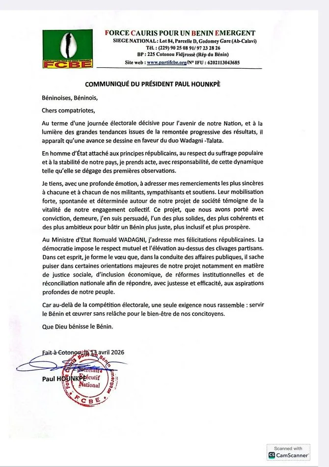 Au lendemain du scrutin présidentiel du 12 avril 2026, le candidat de la Force cauris pour un Bénin émergent (Fcbe), Paul Hounkpè, a réagi à travers une déclaration officielle. Se fondant sur les premières tendances issues du dépouillement, il reconnaît une avance du duo Wadagni-Talata et appelle au respect des principes républicains.