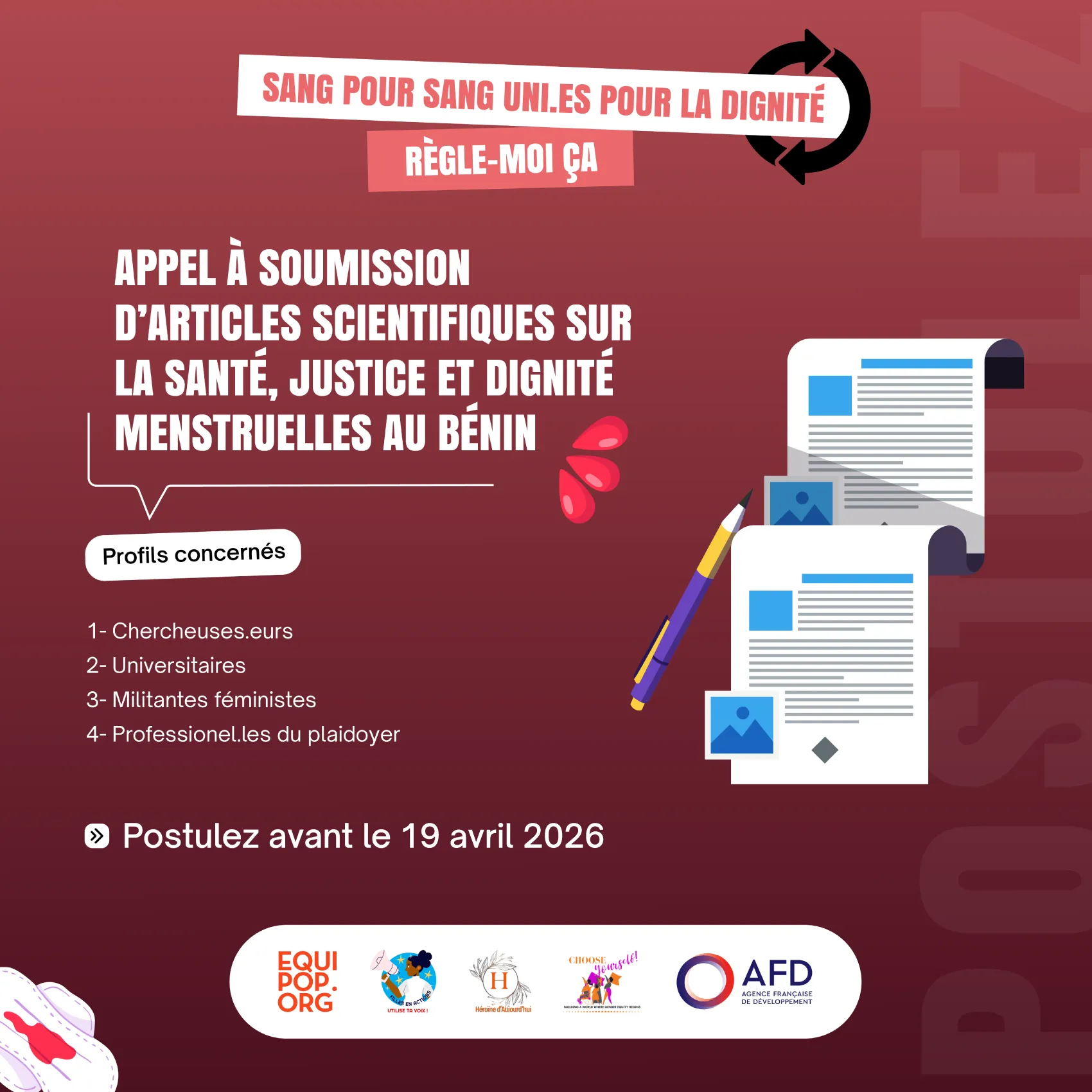 Porté au Bénin par un consortium composé des Ong Filles en Actions, Héroïnes d’Aujourd’hui et Choose Yourself, ce projet s’inscrit dans l’initiative régionale « Sang pour sang : Uni.es pour la dignité », qui ambitionne de faire de la santé menstruelle une priorité dans les politiques publiques des pays concernés. Au niveau international, cette initiative est soutenue par l’organisation féministe française Equipop, avec l’appui financier de l’Agence française de développement (Afd). L’objectif global est de promouvoir l’intégration effective de la santé, de la dignité et de la justice menstruelle dans les programmes gouvernementaux, notamment au sein du ministère des Affaires sociales et de la Microfinance. À travers cet appel à soumission, l’Ong Filles en Actions entend valoriser des travaux scientifiques pertinents, originaux et rigoureux, capables d’alimenter les réflexions et d’améliorer les pratiques en matière de santé menstruelle. L’objectif principal est de rassembler des analyses solides susceptibles d’éclairer les décideurs publics, les acteurs sociaux et les organisations engagées dans la défense des droits liés à la santé menstruelle. Cet appel vise également à promouvoir une approche interdisciplinaire où les perspectives juridiques, sociales, sanitaires, économiques et de genre se croisent afin de mieux comprendre les enjeux complexes liés aux menstruations.