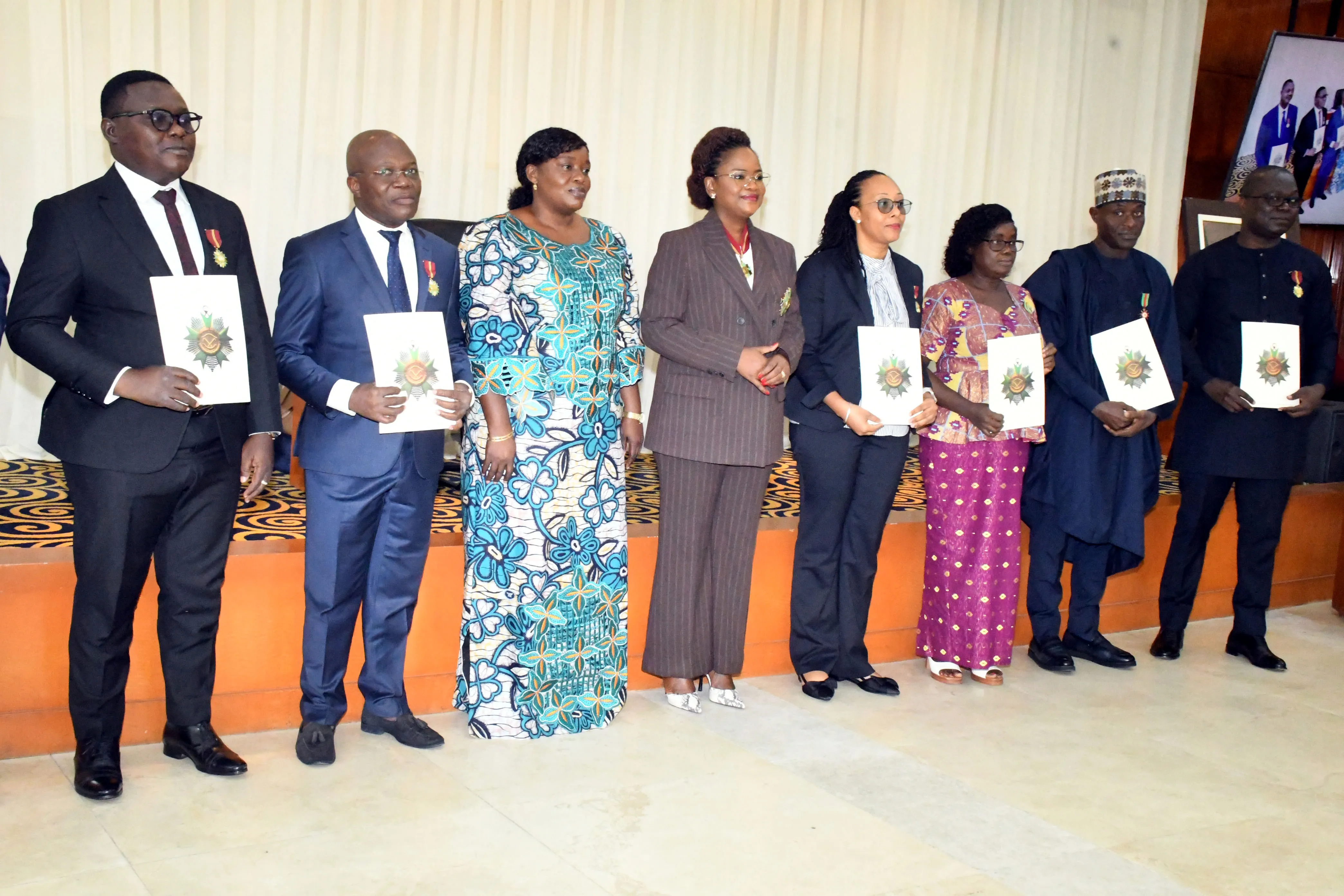 Au total, quatre récipiendaires ont été faits chevaliers de l’Ordre national du Bénin, tandis que trois autres ont été élevés au grade de chevalier de l’Ordre du mérite du Bénin. Une distinction qui consacre des années de service au sein de l’appareil diplomatique et administratif de l’État. « Au nom du président de la République, Grand maître des Ordres nationaux du Bénin, et en vertu des pouvoirs qui nous sont conférés, nous vous faisons chevaliers… ». C’est par cette formule solennelle que Dandi Gnamou, Grand officier de l’Ordre national du Bénin, déléguée par la vice-présidente de la République, Grande chancelière de l’Ordre, a distingué les récipiendaires. Diplomates, secrétaires des affaires étrangères, cadres administratifs et financiers, tous avec des profils particuliers reflètent la diversité des métiers qui concourent à l’action extérieure de l’État. Il s’agit notamment de : Angelo Agbodoyetin, Carmen Albine Morgean, Michel Amannian Ogou, Toussaint Didier Posset, Kora Idrissou Takou Sounon Bori, Hortense Ayaba Adandé Gbegan et Tayéwo Damien Afouda.