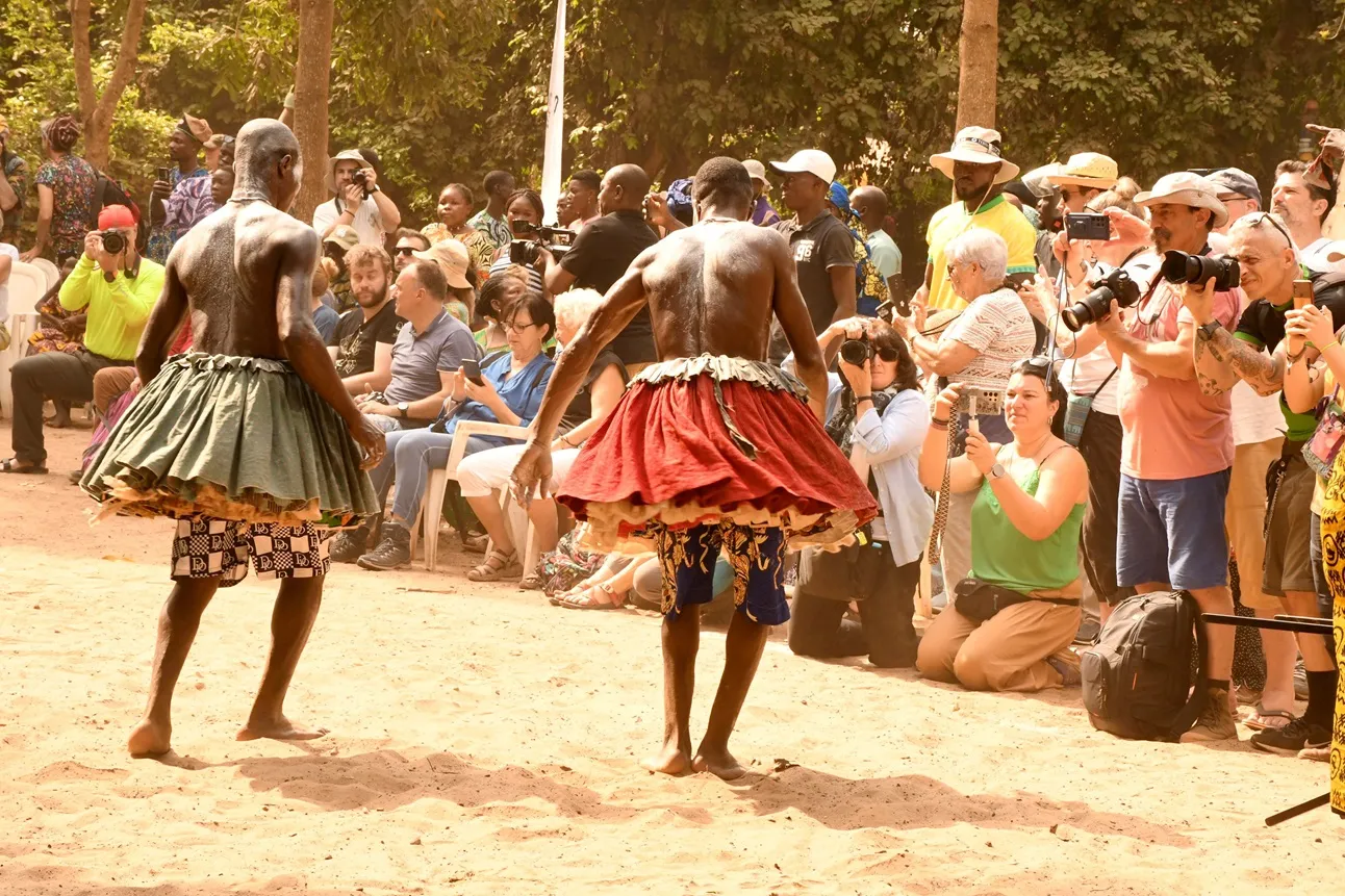 La scène de la grande procession des adeptes s’est ouverte avec une vingtaine d’adeptes bien parés. Ils sont de la divinité Sakpata et cela pouvait se deviner à leurs accoutrements. Leur entrée sur scène rythmée avec l’accompagnement de la chorale et des tambours a été très ovationnée par le public et les autorités présentes. Pas de danse et pirouettes, comme on le leur connaît, ont constitué l’essentiel de leur prestation. Le Sakpata gouverne l’élément terre. Il veille à la bonne santé et fait reculer toute maladie. Il gère aussi la santé. A leur suite, le Vodun Atchina Heviosso qui lui, gouverne le feu donc l’énergie. Il est aussi connu pour protéger contre les énergies négatives et travaille à la paix collective. Il gère le domaine de la Justice. Tout de rouge vêtus, quatre parasols au point, des symboles bien connus de cette divinité, cinq porteurs de Atchina précédés de deux porteurs de drapeau ouvrent la scène. Ils seront suivis des danseurs dont l’énergie sur scène augmentait à mesure que les batteurs de tam-tams redoublaient d’énergie. Leur chorégraphie bien agencée donnait lieu à des relais entre danseurs, danseuses et porteurs de Atchina. Un beau spectacle de couleurs, danses et chants qui témoigne de la richesse de la culture et de l’art Vodun. Le passage du « Assassa » sera sur la même cadence. Le Assassa n’est pas un rituel mais participe de la protection que sollicitent les chasseurs pour une chasse abondante. Deux groupes de six danseurs sont passés sur scène. Le premier tout de blanc vêtu, le second dans un accoutrement de chasseurs. Leurs pas de danse rythmaient le macadam. Suivra un autre groupe de quatre chasseurs, flèches au point. Leurs accompagnateurs jouaient des tambours et soufflaient dans des cornes d’animaux.