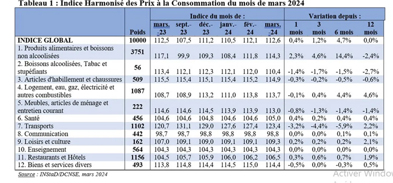 (Les prix des produits locaux en hausse, ceux des produits importés en baisse)L’Indice harmonisé des prix à la consommation du mois de mars 2024 a enregistré une hausse pour ressortir à 112,6 contre 112,1 un mois plus tôt, soit une évolution de +0,4 % selon l’Instad, et le taux d’inflation est ressorti à +1,4 %.