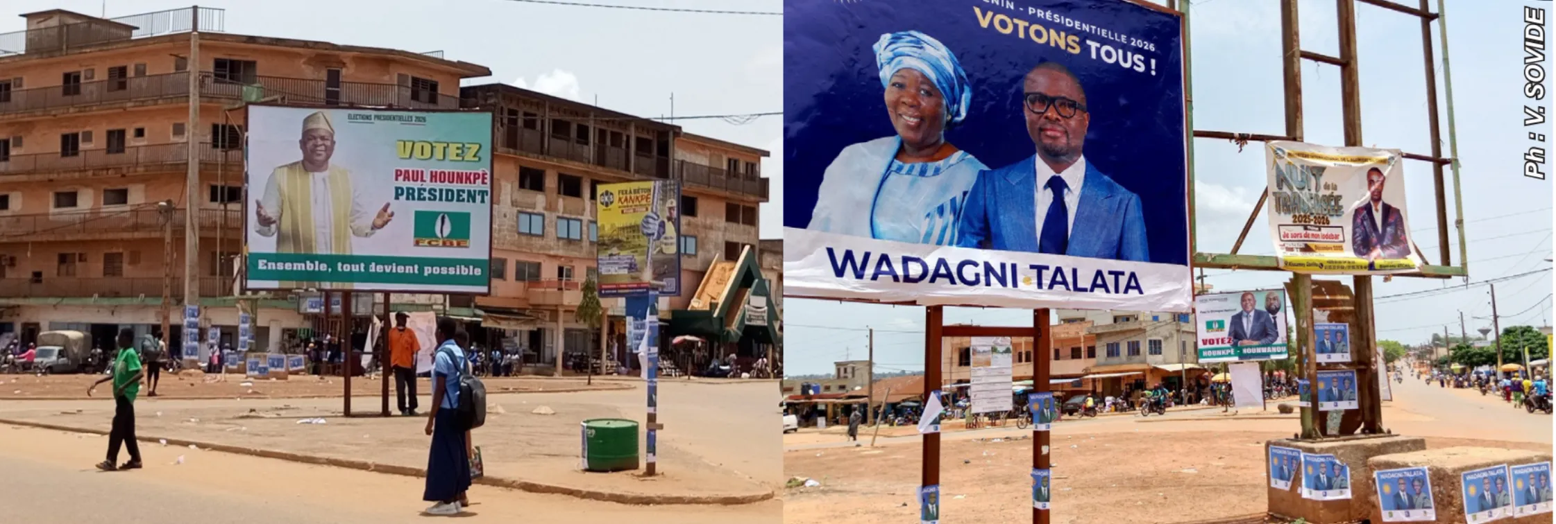 Loin d’Ayomi, à Honton, où nous avons surpris sur le terrain un groupe conduit par Jean-Jacques Kokou Egoudji, la démarche est similaire. Ce dernier et ses collaborateurs mènent des discussions avec des groupes de femmes pour les convaincre de voter pour le duo Hounkpè-Hounwanou, afin de permettre à la localité de bénéficier d’infrastructures de développement et de sortir de la pauvreté. Selon J.-J. K. Egoudji, le choix des candidats Fcbe garantit aux Béninois « la réduction de la cherté de la vie, l’amélioration des conditions d’exercice du commerce dans les marchés et le secteur de l’artisanat, ainsi que le recrutement massif dans la fonction publique et le reversement automatique des aspirants au métier d’enseignant (Ame) ». À l’en croire, c’est son duo, Hounkpè-Hounwanou, qui peut faire du Bénin « un pays uni, de paix, démocratique, un État de droit et de justice sociale, bien gouverné, attractif et ouvert aux investisseurs nationaux et étrangers ; un pays compétitif, résilient face aux changements climatiques, aux crises économiques et sanitaires, créateur de richesses, capable d’éradiquer le chômage, la misère et la pauvreté, et répondant de façon équitable aux besoins d’une presse libre, d’une éducation et d’une formation adaptées aux besoins des secteurs public et privé, dans un cadre de bien-être culturel et socio-économique au service de toutes les couches de la population ».