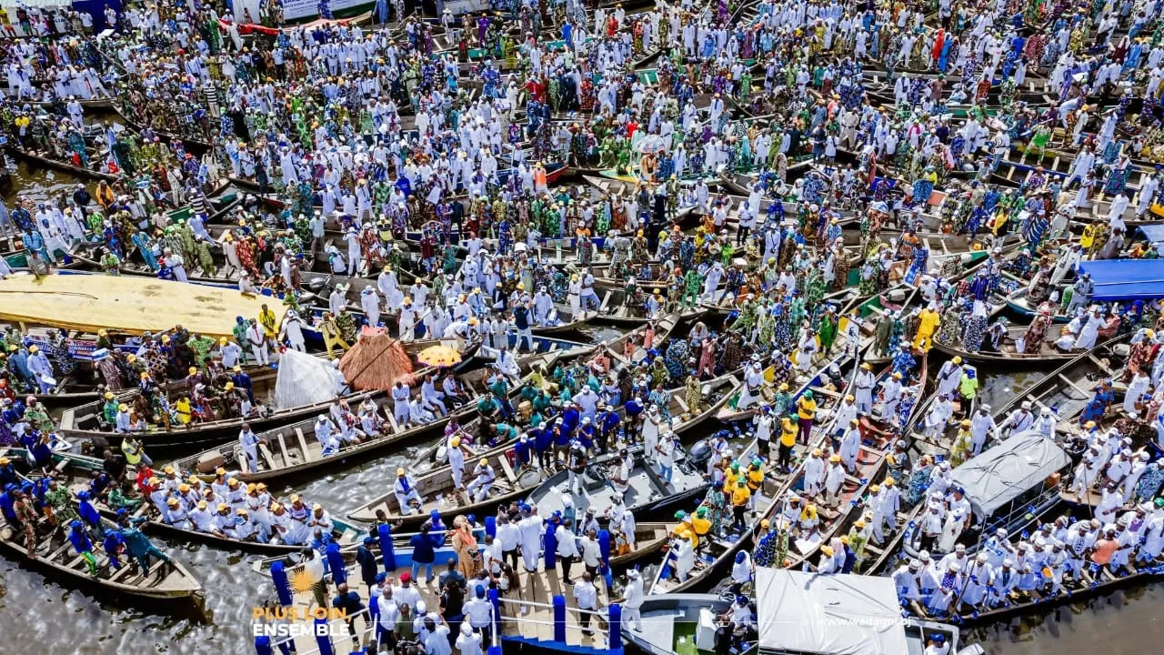 Bien avant l’arrivée du duo candidat, le décor était planté. À perte de vue, des dizaines de pirogues traditionnelles et des barques motorisées, ornées aux couleurs du duo Wadagni-Talata, ont convergé vers le point de ralliement. Le spectacle était saisissant : une marée humaine flottante, où le clapotis de l’eau se mêlait aux slogans et cris de ralliement des populations et au vrombissement des moteurs. Pour la circonstance, la cité lacustre s’est vraiment déployée pour offrir ce qu’elle a de plus beau à ses hôtes.