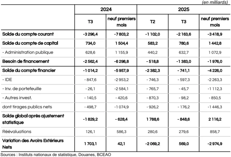 Dans ce contexte, le besoin de financement de l’Union s’est réduit à 1.382,9 milliards, contre 2.562,4 milliards un an plus tôt. Il a été couvert à hauteur de 37,2 % par des entrées nettes de capitaux au titre du compte financier, malgré une baisse de 26,9 % des flux, liée notamment à la contraction des investissements directs étrangers. Le solde global de la balance des paiements s’est amélioré de 980,6 milliards en glissement annuel, ressortant déficitaire de 848,6 milliards au troisième trimestre 2025. Sur les neuf premiers mois de l’année, il affiche un excédent cumulé de 2.116,2 milliards, traduisant une consolidation progressive de la position extérieure de l’Uemoa.