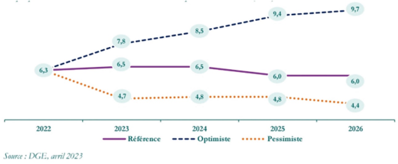 Dans l’hypothèse d’une atténuation rapide des tensions géopolitiques, une non-aggravation de la situation sanitaire et une évolution favorable des autres risques qui pèsent sur l’économie, le taux de croissance pourrait grimper à 8,5% en 2024 et atteindre même 9,7 % en 2026. Ce scénario optimiste suppose des conditions climatiques et des conditions financières particulièrement avantageuses, propres à une mise en œuvre rapide des réformes structurelles et des investissements structurants.