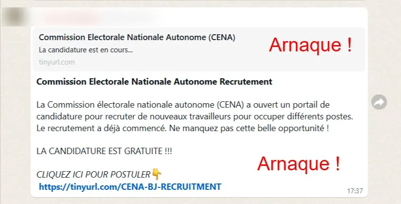 La publication WhatsApp et Facebook annonçant que la Commission électorale nationale autonome (Cena) procède actuellement à un recrutement est fausse. Il s’agit d’une tentative d’hameçonnage.