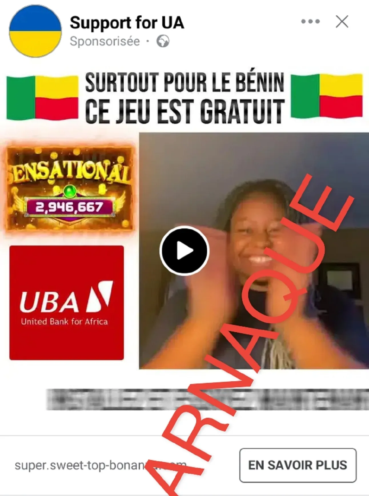 Cette vidéo publicitaire diffusée sur Facebook faisant la promotion de jeu en ligne avec des drapeaux du Bénin est fausse. Il s’agit d’un stratagème des cybercriminels pour spolier les internautes.