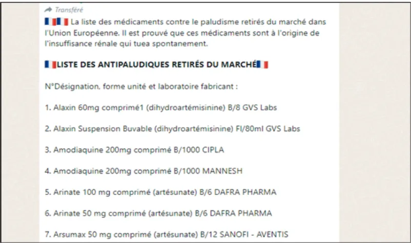 Publication WhatsApp au sujet des 49 « médicaments antipaludéens retirés du marché européen »
