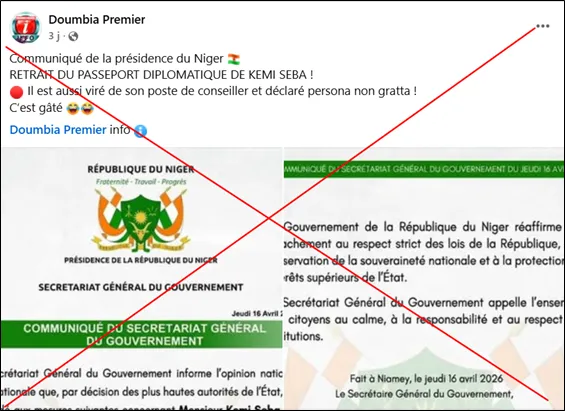 Un document circulant sur les réseaux sociaux, depuis le 16 avril 2026, affirme que l’activiste Kèmi Séba aurait été démis de ses fonctions à la présidence et privé de son passeport diplomatique nigérien, et déclaré persona non grata au Niger. Après vérifications, ce communiqué attribué au gouvernement nigérien est faux.