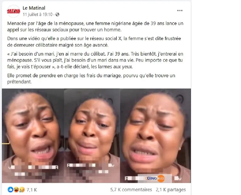 L’histoire publiée est un canular. La première recherche effectuée sur Facebook à partir des mots « I need, husband, I will, sponsor, marriage » mène vers la page intitulée Officer Ada Tv, avec 341 000 followers et 37 suivis. Une vidéo de 3 minutes 30 secondes portant la légende « I need a husband am 39 years old », y a été publiée le 5 juillet 2024. Elle montre la même femme que celle figurant sur la vidéo publiée sur Doing buzz et vue sur la photo des publications Facebook. La femme affirme en langue anglaise qu’elle a « 39 ans » ; qu’elle « recherche un mari, car elle fatiguée du célibat et proche de la ménopause » et qu’elle « est prête à financer les dépenses liées au mariage ». Sauf que son histoire est une blague, car d’autres vidéos et photos la montrant évoquer le même sujet y compris en public, sont visibles sur la page ; de même que plusieurs autres scènes humoristiques dont elle est l’actrice principale. Dans une nouvelle vidéo, le 2 août 2024, elle promet « 10 millions à tout homme qui voudrait l’épouser ».