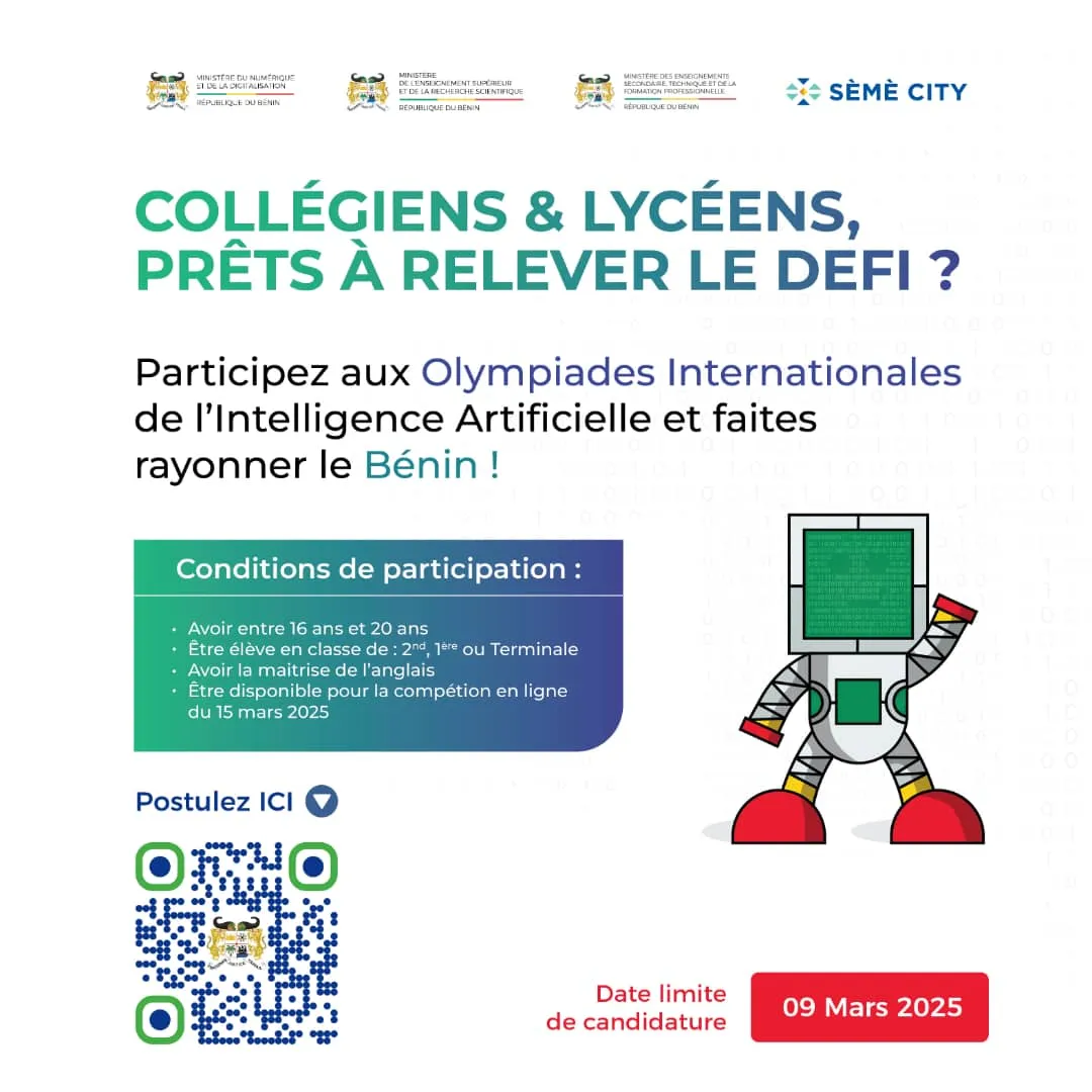 Dans un communiqué, le ministère du Numérique et de la Digitalisation (MND), en partenariat avec le ministère de l’Enseignement Supérieur et de la Recherche Scientifique (MESRS), le ministère des Enseignements Secondaire, Technique et de la Formation Professionnelle (MESTFP) et l’Agence de Développement de Sèmè City (ADSC), annonce l’ouverture des candidatures pour sélectionner les élèves qui représenteront le Bénin aux Olympiades Internationales de l’Intelligence Artificielle (IOAI) 2025.