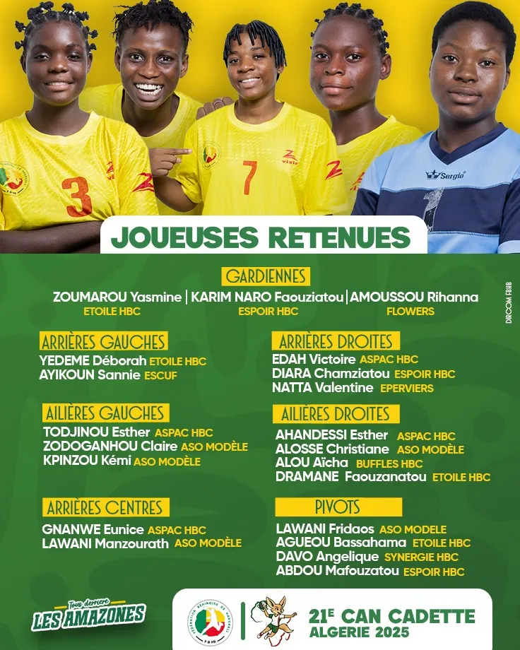 La liste des joueuses regroupe des talents issus de clubs tels que Etoile, Aspac, Aso Modèle, Buffles, Synergie, Flowers, Espoir ou Escurf. Parmi elles, figurent des noms déjà connus dans les compétitions nationales et continentales, à l’instar de Yasmine Zoumarou (Etoile), Faouziatou Karim Naro (Espoir), Victoire Edah (Aspac) ou encore les sœurs Lawani, Fridaos et Manzourath (Aso Modèle). Ces jeunes athlètes ont déjà participé aux Gymnasiades de Bahreïn (2024), au Challenge Trophy de l’Ihf à Abidjan (médaillées de bronze, 2025) et à la première édition des Jeux scolaires africains en Algérie (août 2025). Ce stage constitue une étape importante pour renforcer l’esprit compétitif et la cohésion du groupe. Le Bénin, logé dans le groupe A aux côtés de l’Angola, du Nigeria, de la Tunisie, du Kenya et de Madagascar, devra se mesurer à des équipes de haut niveau. Le groupe B comprendra l’Égypte, la Guinée, l’Algérie, le Burkina Faso et la Zambie. Au-delà de la compétition continentale qui se déroulera, du 14 au 21 septembre 2025, le championnat servira également de qualification pour les Championnats du monde Cadets Féminins 2026. Les quatre premiers pays représenteront l’Afrique à l’échelle mondiale, tandis que le pays le mieux classé à l’issue du tournoi pourra participer à la phase intercontinentale de l’IHF Trophy et conserver une chance de qualification pour le championnat du monde si le classement final le permet.